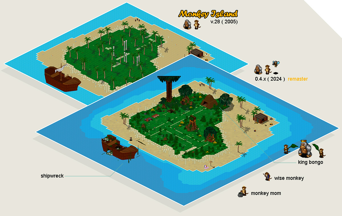 Accessing Monkey Island has become challenging since the boat sailing to the island stranded amidst turbulent waters. The only entrance to the island now involves traversing a dangerous path infested with jungle biters. Only the most resilient adventurers dare to embark on this quest to rediscover the forgotten Monkey Island, where they'll discover that a lot has changed on the island over time. Efforts have been made to maintain the island's original state while allowing it to change due to the shipwreck event, which enabled the monkeys to find and utilize materials, evolving them by building new structures on the island.