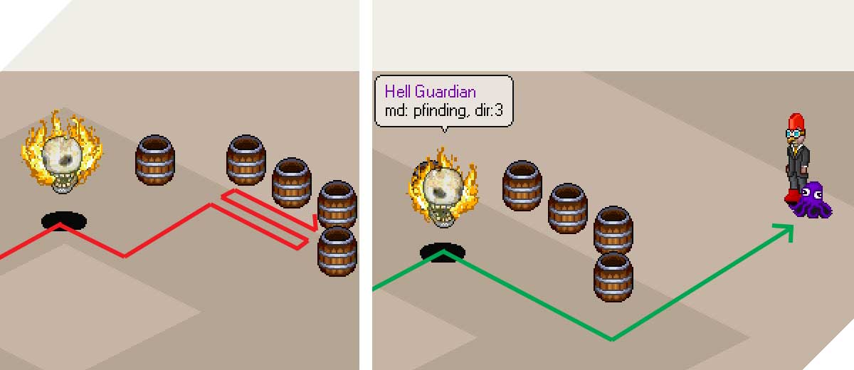 The previous (classic) EO npc code relied solely on direct homing, where npcs would navigate directly to their target with limited smoothing, solving most basic situations. While functional, this approach could still result in npcs getting trapped or tricked behind objects.