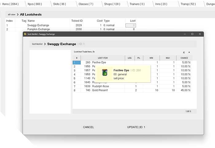 The latest update to Pub Studio introduces full visual editing capabilities. World designers can easily create and modify game lootchests using an intuitive interface. All changes made are automatically saved in efficient binary pub-format files, ensuring seamless compatibility with both the server and client.